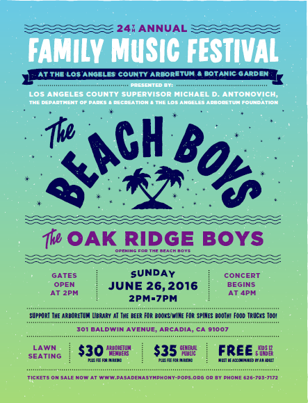 Tickets are now on sale for The Beach Boys concert at the 24th Family Music Festival on Sunday, June 26, 2015 at the Arboretum. Tickets may be purchased online or at the Arboretum Gift Shop. The Festival is presented Los Angeles County Supervisor Michael D. Antonovich, the Los Angeles County Department of Parks & Recreation and the Los Angeles Arboretum Foundation.